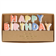 A simple way to turn a cake into a birthday delight is with these mini candles. They spell out the words "Happy Birthday" in a colorful way.