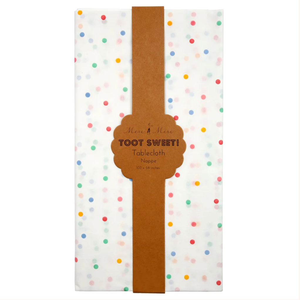 Hvit papirduk med fargerike prikker, perfekt til barnebursdag og fest.250 x 130 cm.Det finnes tallerkner, kopper, hatter, cupcake kit og bursdagsbanner i samme serie.