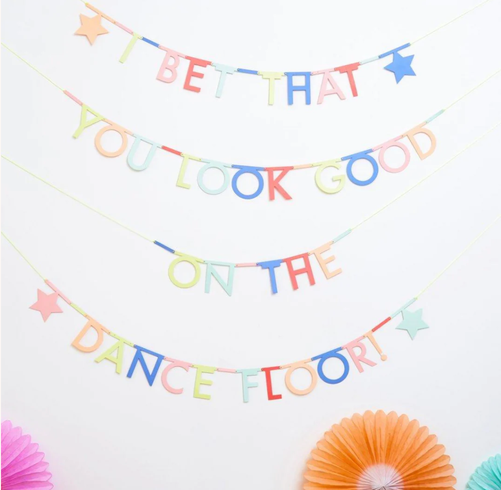 Create a colorful message and hang it on a neon garland with this letter garland kit. It comes with a complete collection of alphabet, symbol and number pennants in bright colors and a length of neon yellow twine.