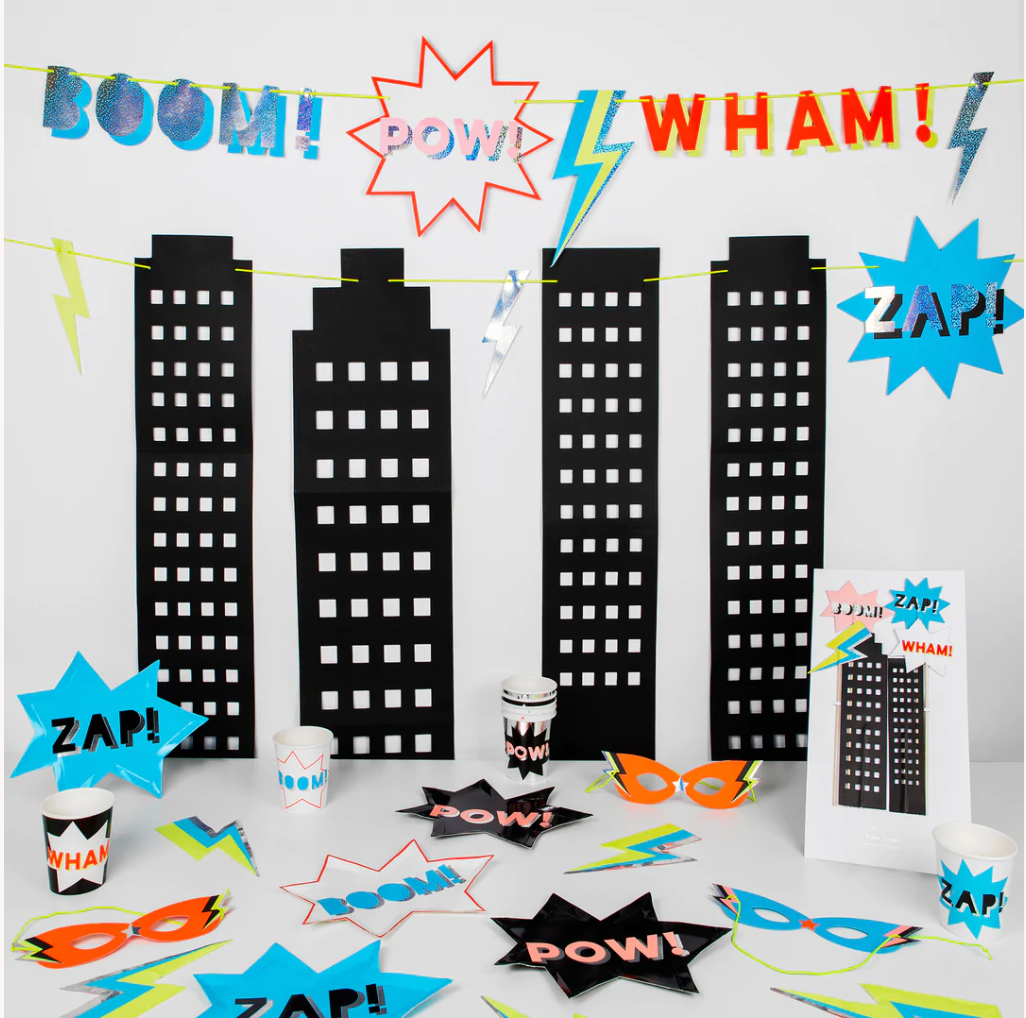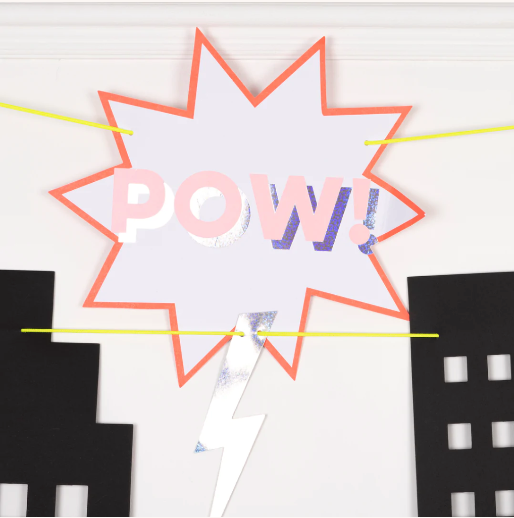 Du kommer til å elske denne girlander! Fine detaljer i lyse farger og morsomme tekst som "Boom!, Pow, Wham! and Zap!"