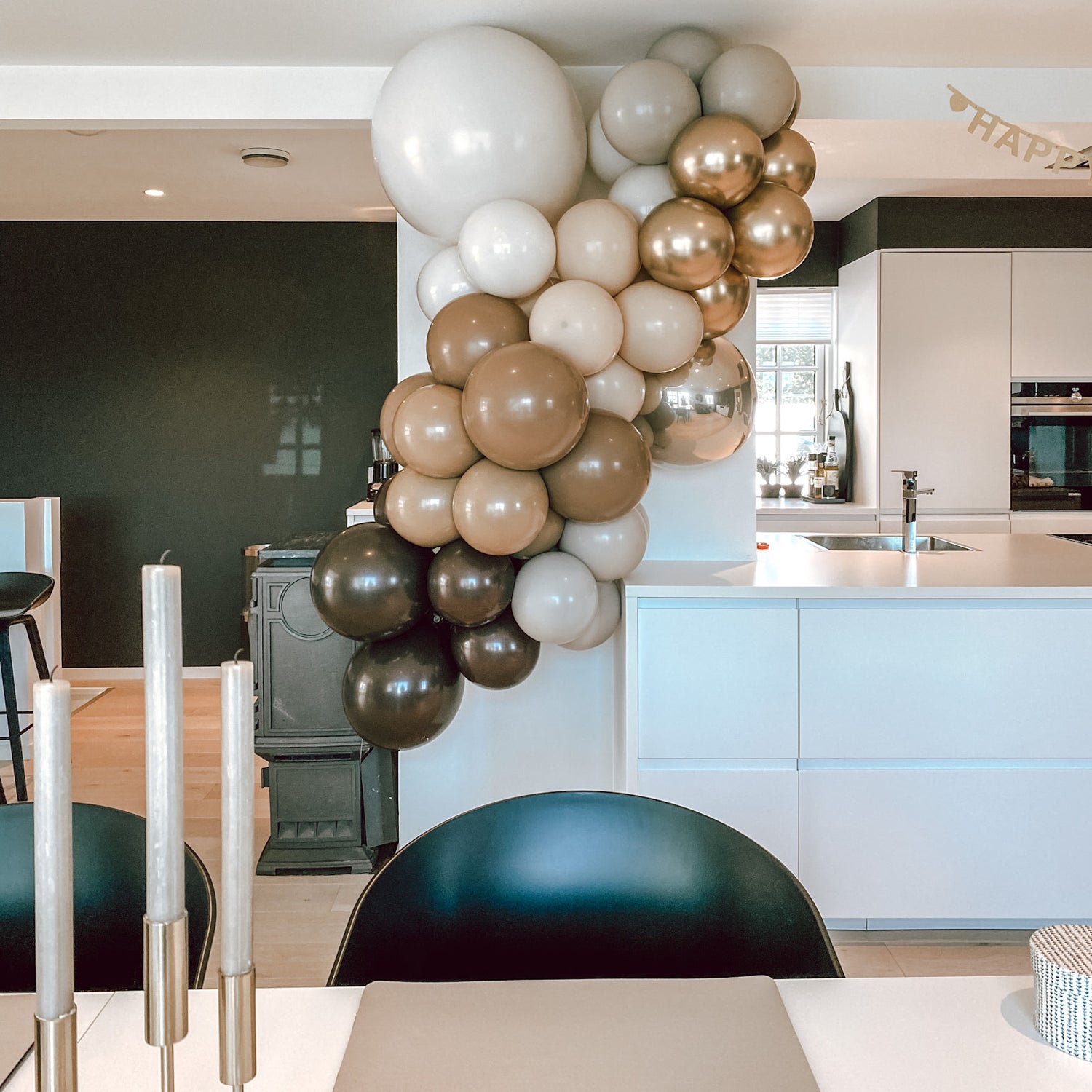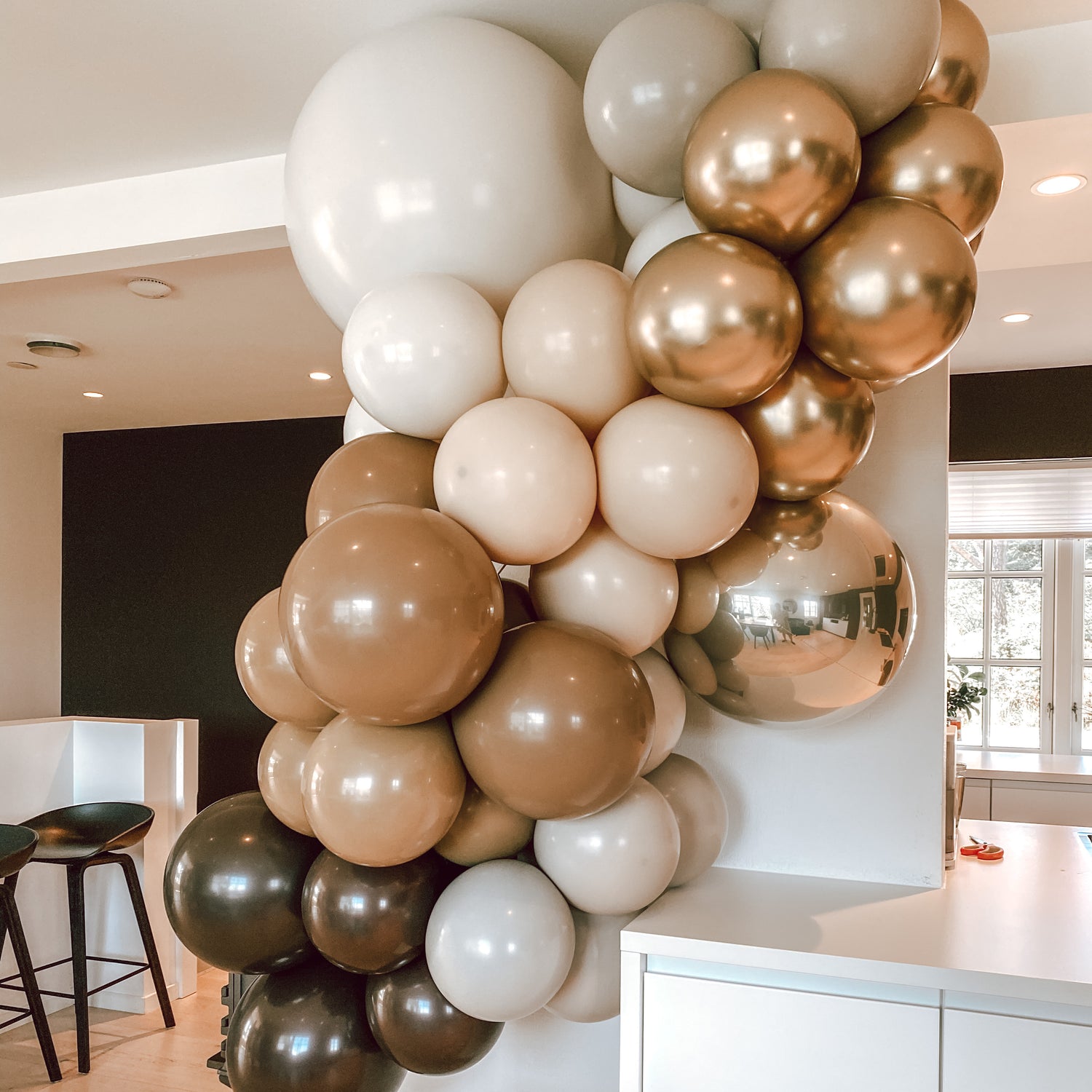 Nå leverer vi en ferdig oppblåst ballongsky med vår signatur stil. Perfekt til pynt av stue, balkong eller en hagefest.
