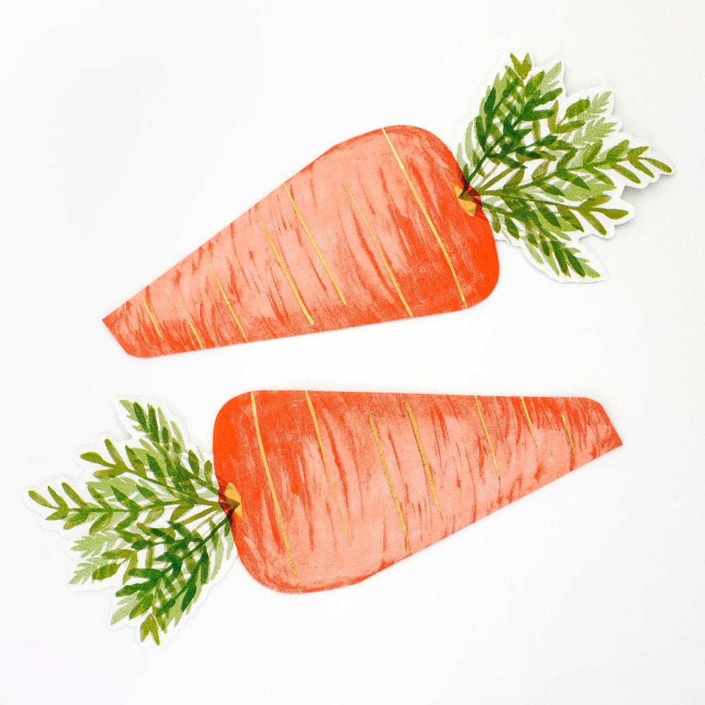 I pakken får du 16 servietter som er formet som gulrøtter; oransje med grønn bladdusk og fine gullfoliedetaljer.