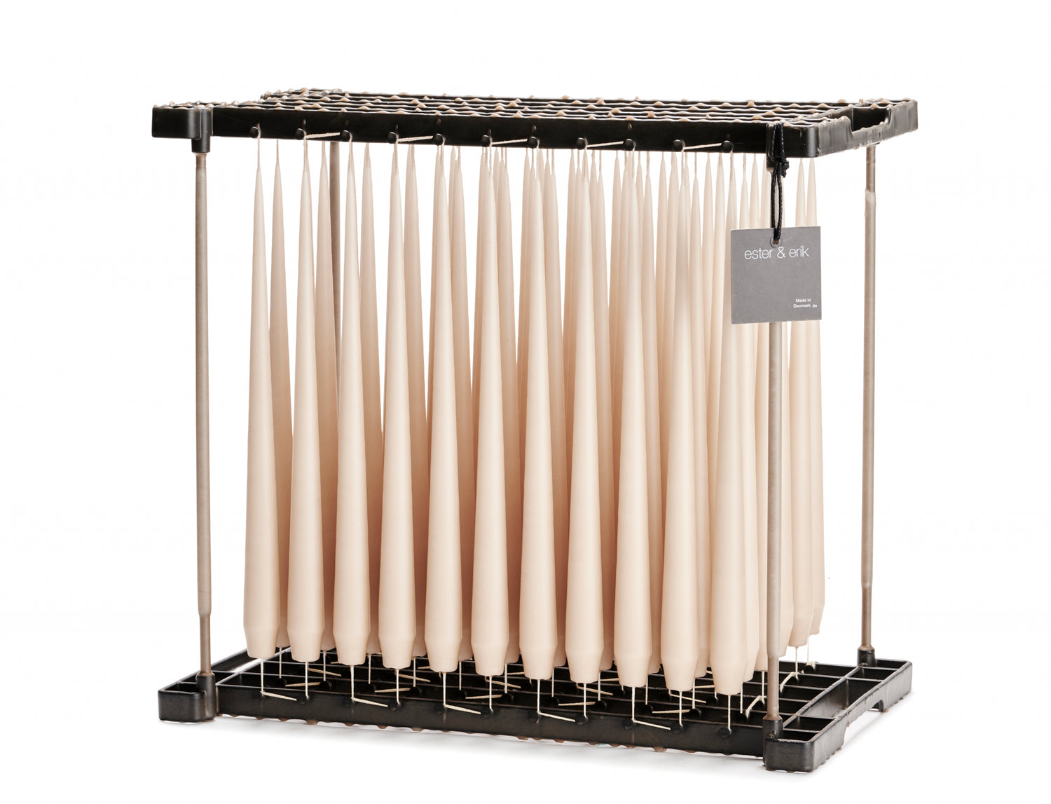 De selvslukkende lysene brenner med en rolig og jevn flamme. De er håndlagede, høye og slanke, og har en elegant spiss som kjennetegner Ester & Erik-lys.