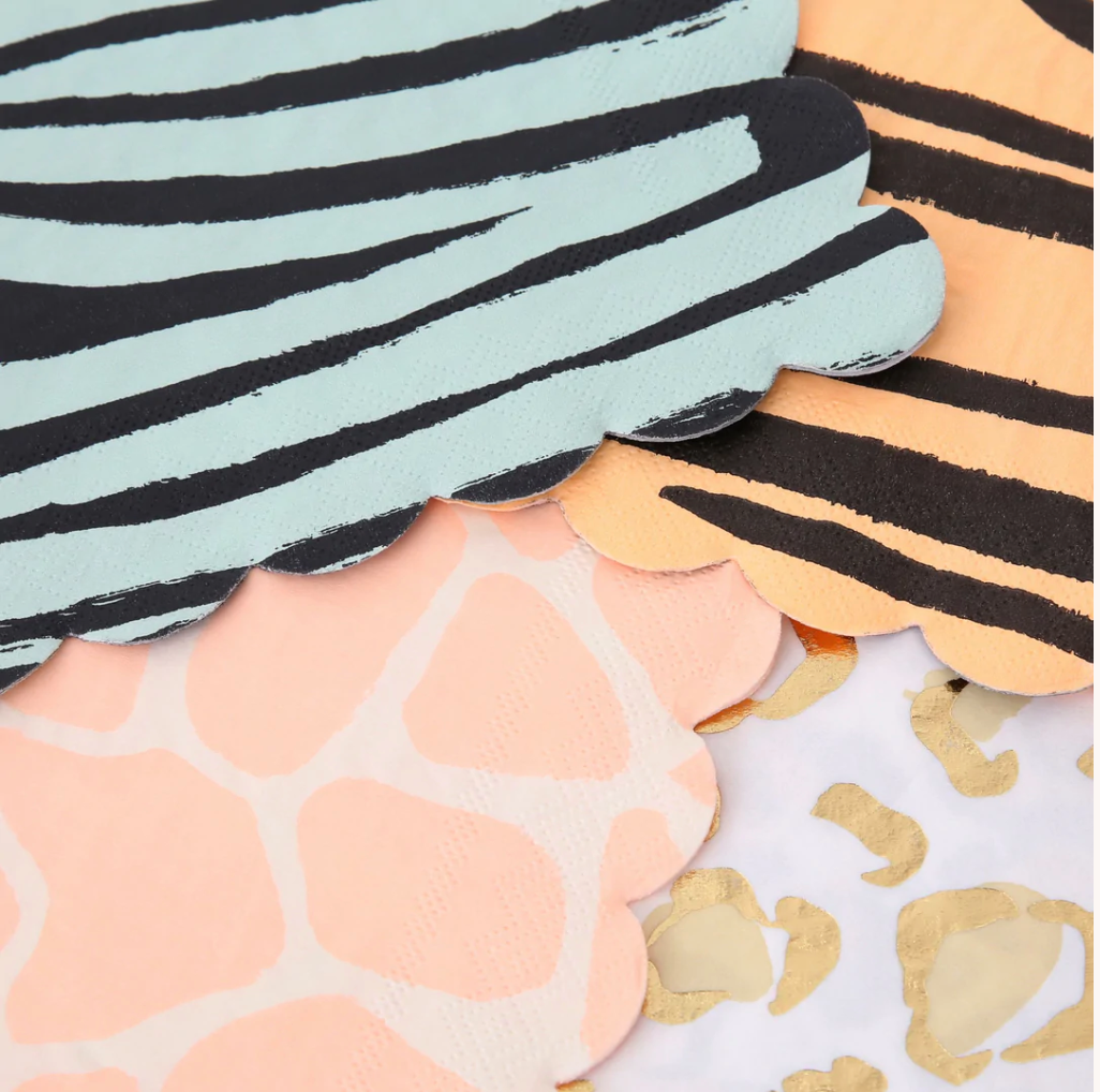 Disse serviettene vil se perfekte ut på en fest med safari- eller dyretema. Ideell for å legge til farge og stil på bordet. Med fire design, alle med neontrykk og gullfoliedetaljer og en stilig kant.