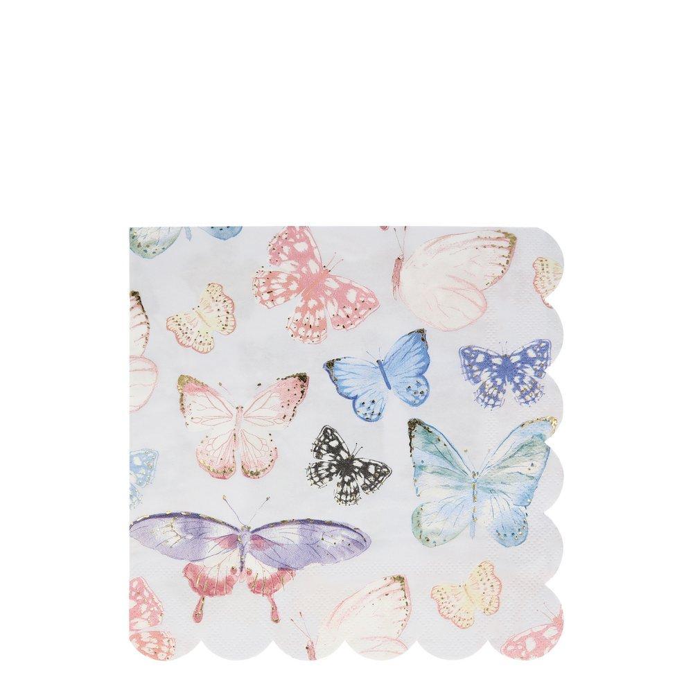Disse vakre sommerfuglserviettene ser veldig spesielle ut på enhver fest. Med fargerike sommerfugler med vakre gullfoliedetaljer og en stilig kamskjellkant.